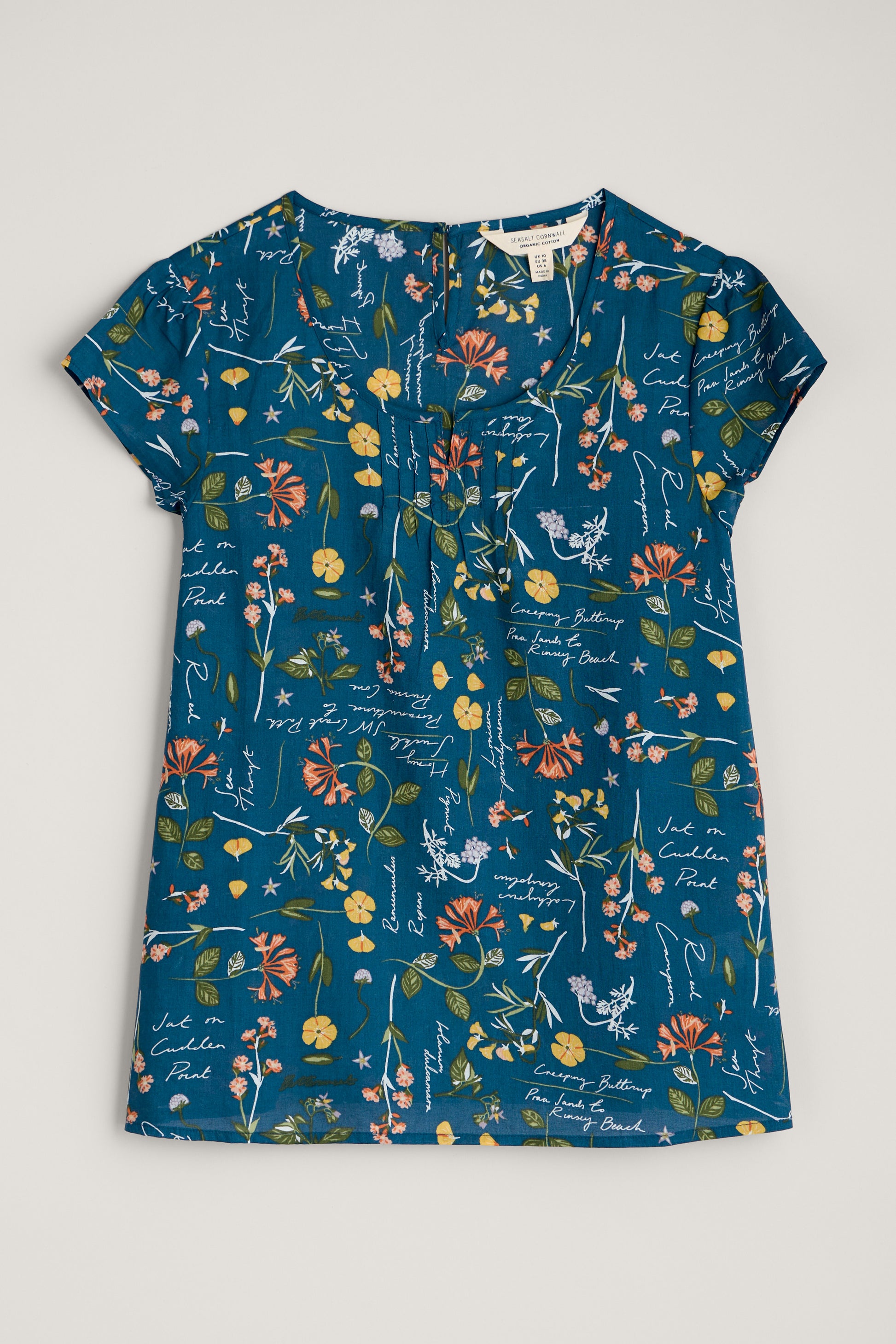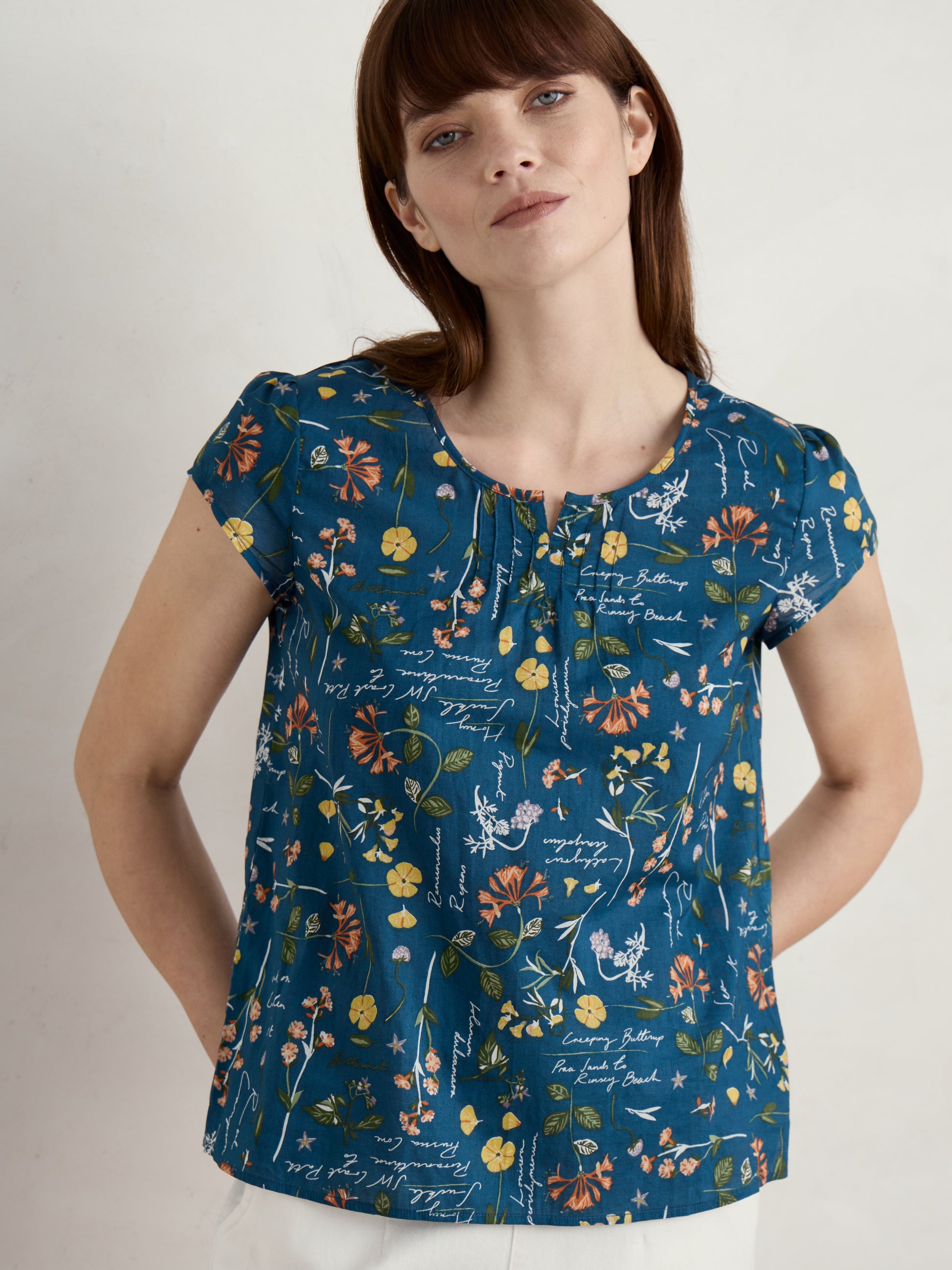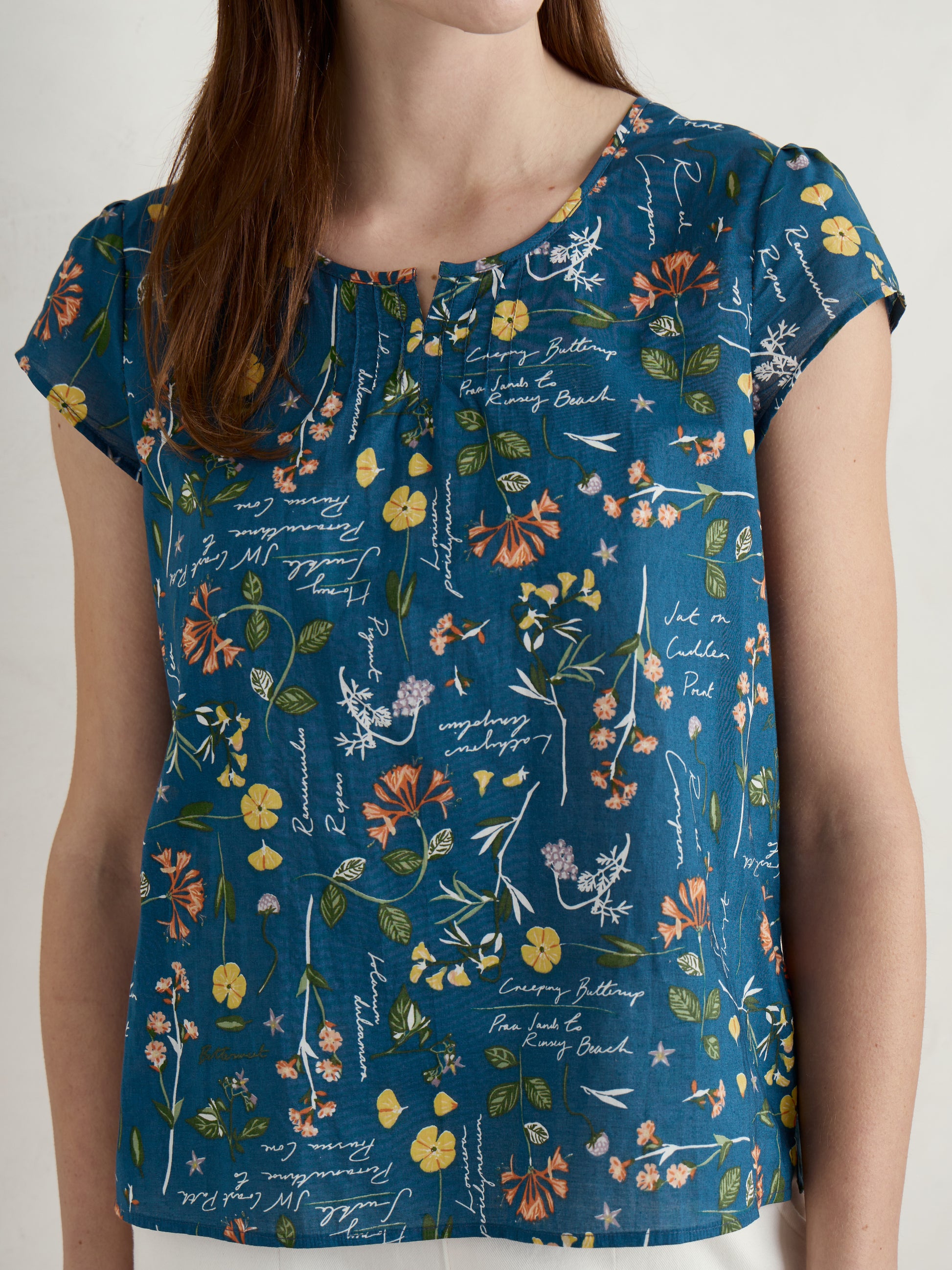 An adorable top crafted from lightweight, breathable cotton voile. Our Garden Gate top features a semi-fitted silhouette, complete with a scoop neckline and charming cap sleeves. Delicate gathers on the front offer subtle shaping, while a keyhole opening with button loop closure adds a finishing touch to the back.